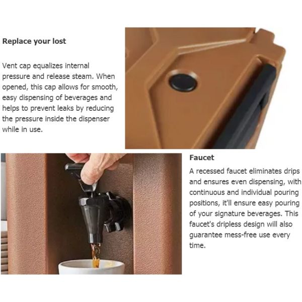 This dispenser servings, making it ideal for various catered events. It can also hold and dispense hot or cold beverages; no matter the temperature, the insulated design helps maintain it for up to 7 hours. Perfect for catering, the dispenser provides excellent reliability and durability. It even features a dripless faucet to prevent a messy situation and rugged built-in handles for easy transport.